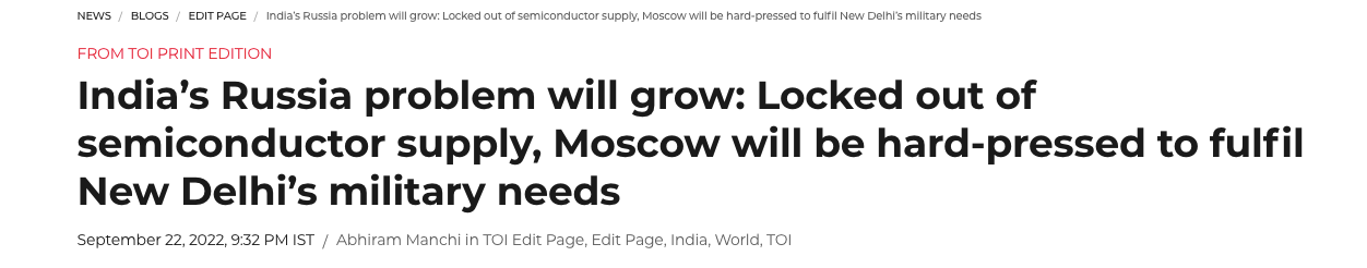 Abhiram Manchi (GCTP 8) & Pranay Kotasthane wrote an article for The Times Of India on Russia's chip problem, and its implications for India.